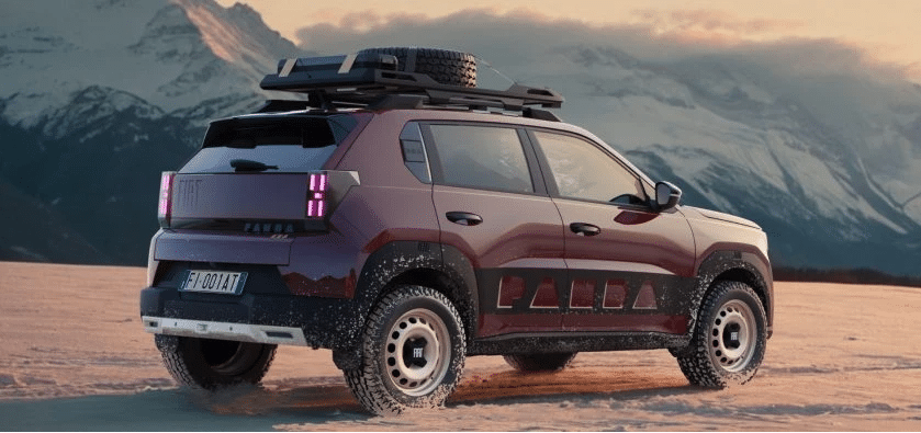 Cette architecture permet à Fiat de moderniser la Panda 4×4 sans la dénaturer. Le gabarit reste contenu, la philosophie reste la même : aller partout, simplement. Le style extérieur renforce ce lien avec le passé : peinture bordeaux, éléments beige, protections renforcées et galerie de toit donnent à ce concept une allure de baroudeuse chic. On y retrouve même la roue de secours sur le toit, clin d’œil assumé aux véhicules tout-terrain des années 80.